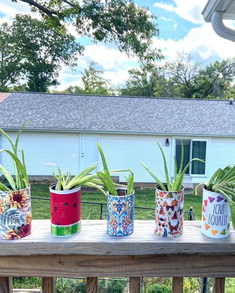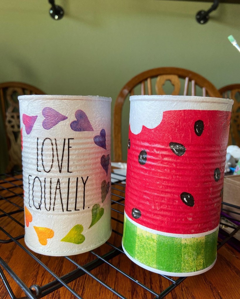 The thought of decoupage tin cans came to mind. In a family of 5, tin cans are easy enough to come by…hell…on any given day I could harvest 2-3 easily. So that’s what I did. Small cans, big family size soup cans, medium size cans…all different sizes for the recycling; a second life was definitely on the table.
